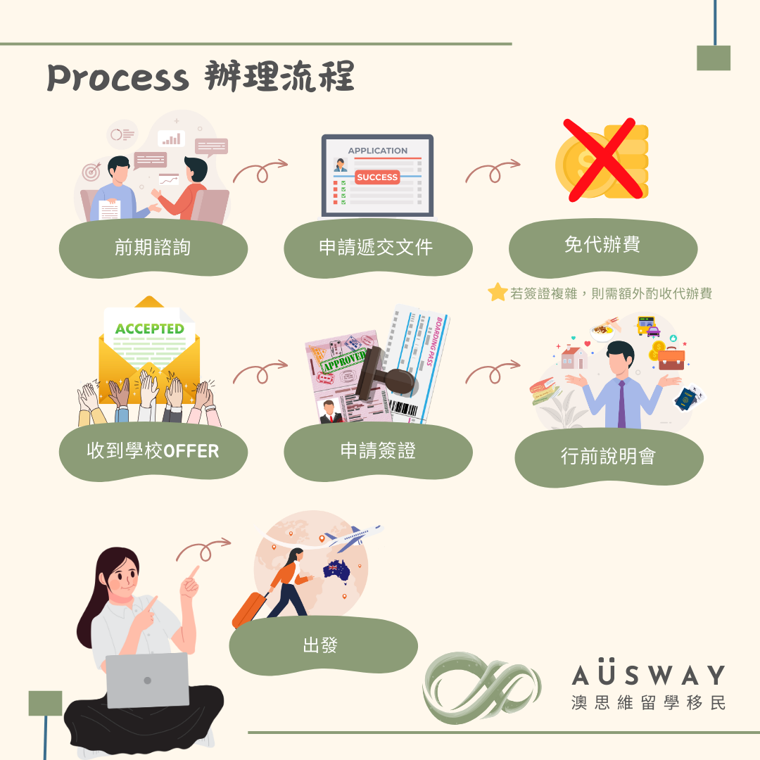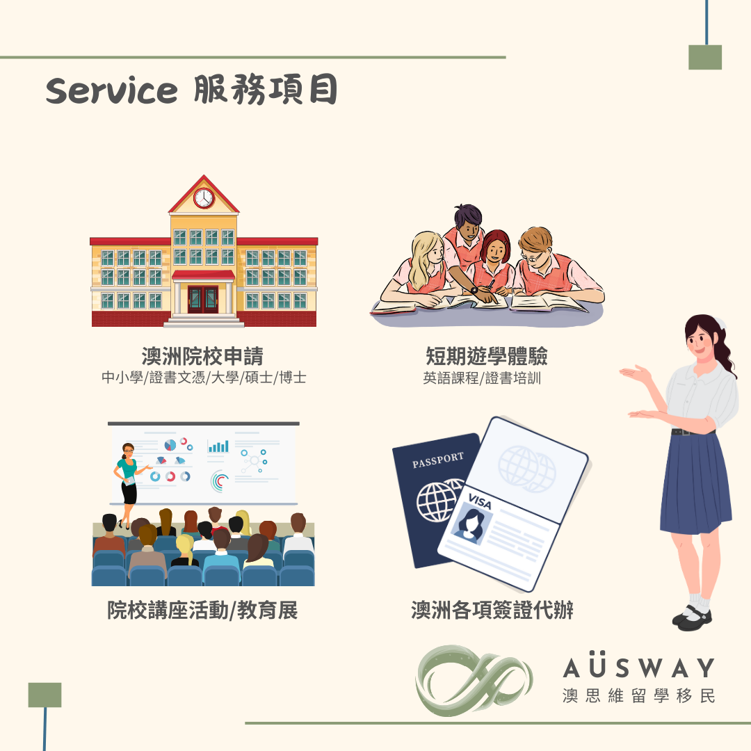 諮詢溝通,顧問們也將確保規劃的⽅案符合客⼾的讀書計畫或是簽證選項,絕不推薦不適合客⼾的課程及簽證。另外,澳思維也是留學與移⺠雙公會的成員之⼀,值得信賴與安⼼! 澳思維相當重視每⼀位客⼾,貼⼼溫暖地協助所有學⽣與客⼾,希望客⼾們都能夠順⼼順利的完成留學與移⺠之路,我們的服務精神 – A u s w a y , a l w a y s s u p p o r t y o u ! 您的留學移⺠之路,由我們細⼼守護! !