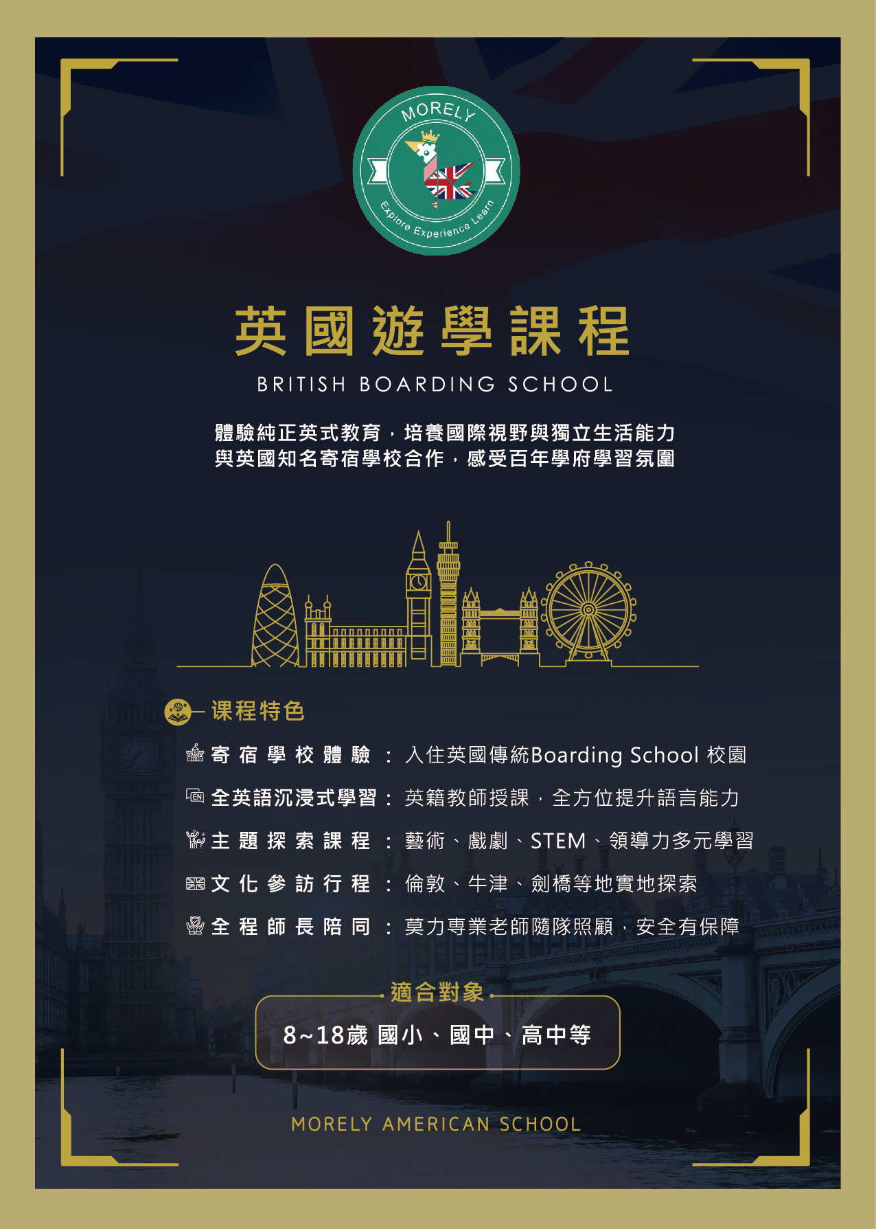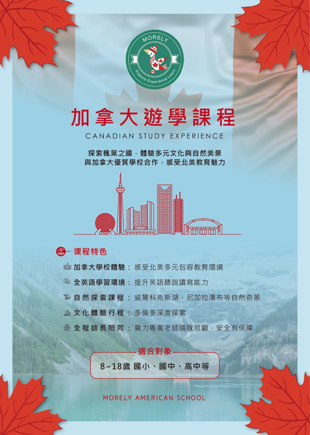 自創立以來,莫力團隊秉持「教育是陪伴孩子看見世界的橋樑」之理念,規劃多元化的遊學項目,包括加拿大、英國、美國、菲律賓及日本等地,課程內容涵蓋語言學習、文化交流、寄宿體驗與國際冒險活動,讓孩子從實際生活中培養語言力、自信心與國際觀。
